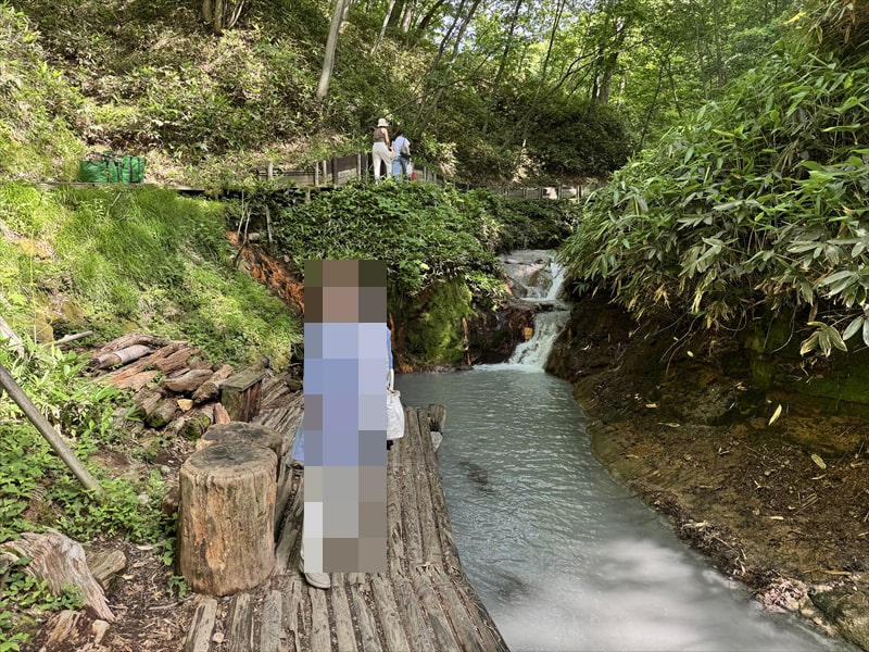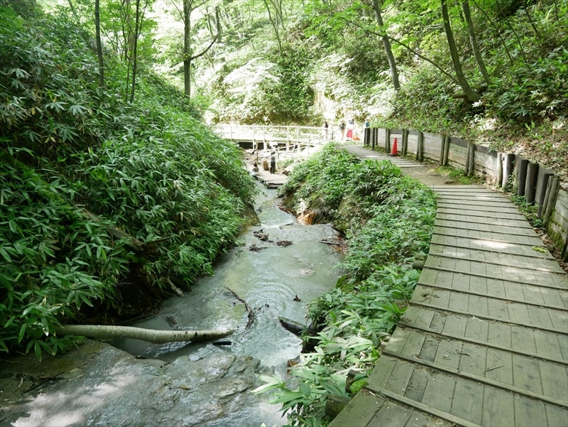 大湯沼川天然足湯は大湯沼駐車場から道を350メートル程戻った場所に大湯沼川探勝步道の入り口があります。