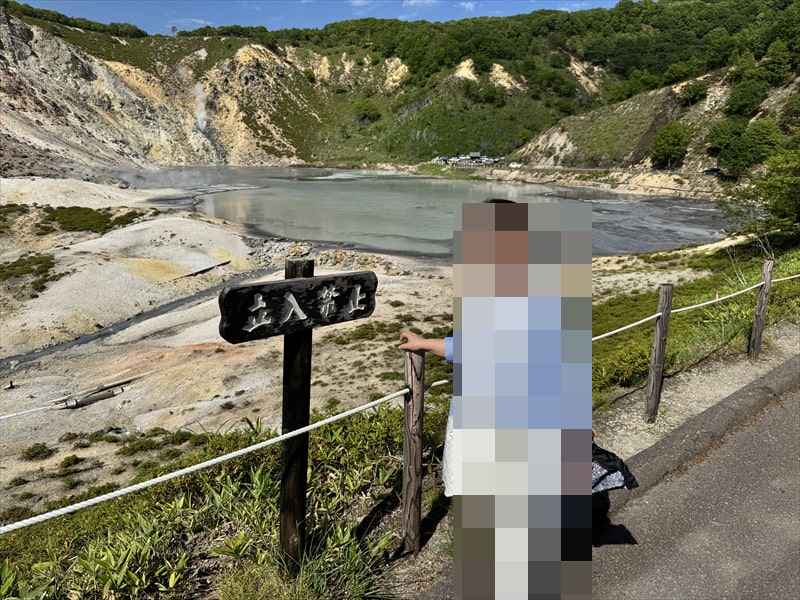 地獄谷の看板のある近くにはボランティアの観光スタッフが居ますので、人間三脚をお願いすれば記念写真を撮ることができました。
