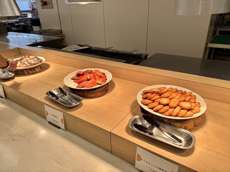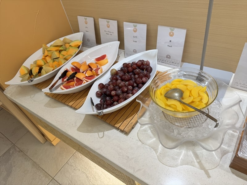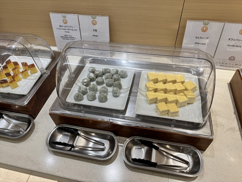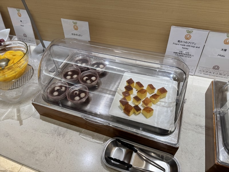 デザートも登別閻魔まんじゅうやメロン、グレープフルーツ、ぶどう、桃、チョコレートケーキ、白桃ムース、アーモンドゼリーソース・ショコラ、プチシュー、ミルクレープ、ダブルベリーケーキ、大福、糀みつのフリアン、白玉ぜんざいなどがありました。