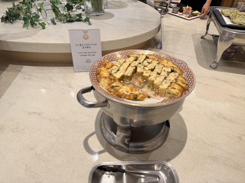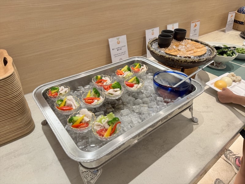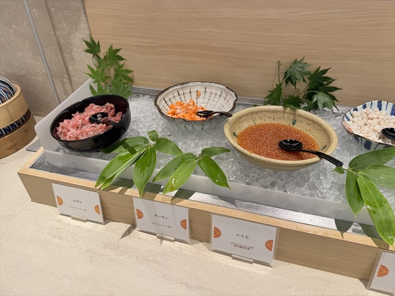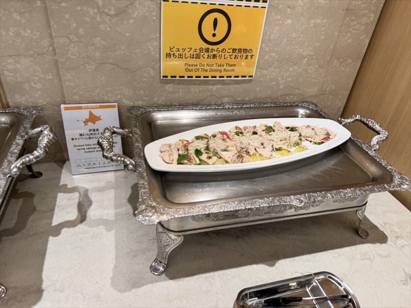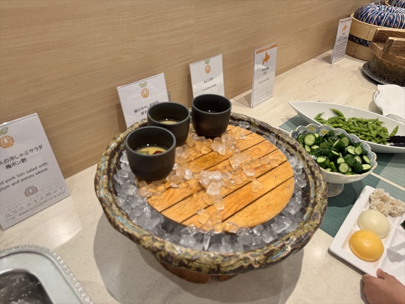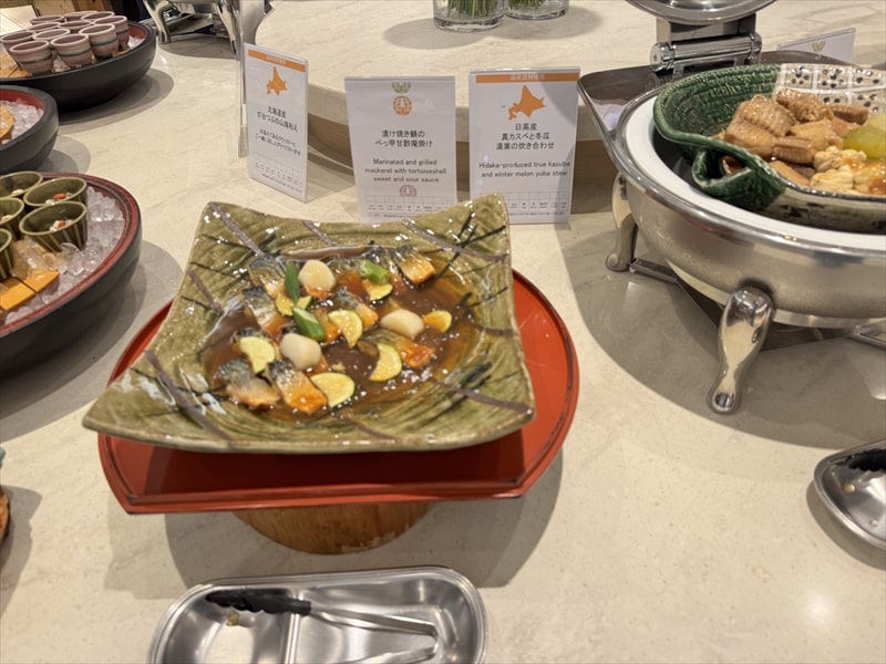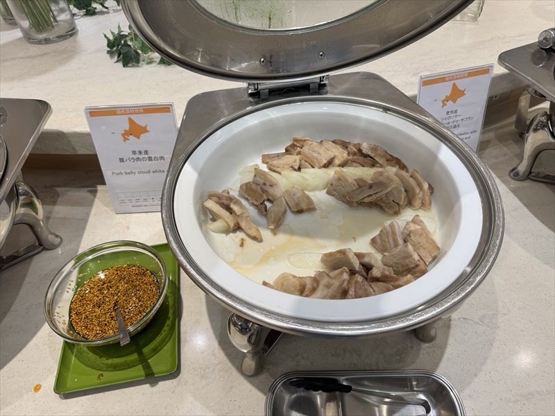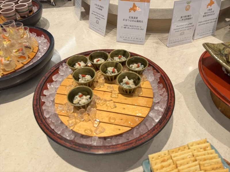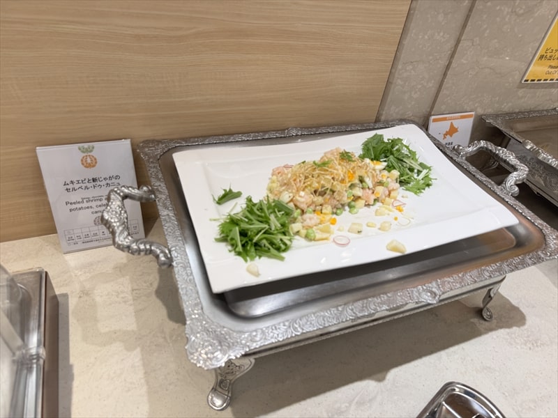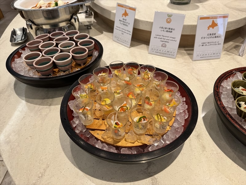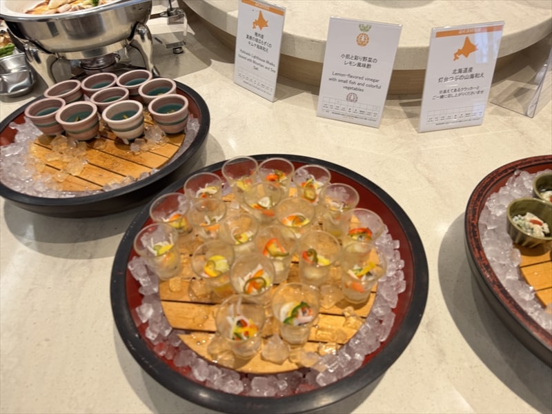 ビュッフェ料理は他には漬け焼き鯖のべっ甲甘酢庵掛け、日高産真カスベと冬瓜湯葉の炊合せ、鰻の冷し茶碗蒸し、カニ身とニラキャベツの玉子寄せ、ムキエビと新じゃがのセルベル・ドゥ・カニュ、北海道産フライドポテト、マルゲリータピザ、牛ステーキ、北海道産イワシと十勝マッシュのアヒージョ、ラム肉のグリル、ひらめの香草パン粉焼き、牛肉の煮込みハンガリー風、鶏の唐揚げ、ボンゴレビアンコ、早来産豚バラ肉の雲白肉などがあります。