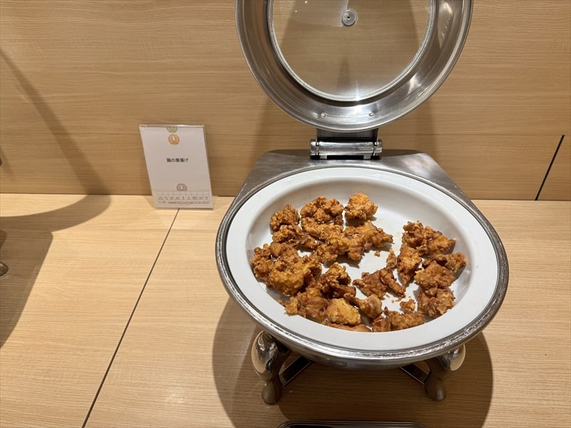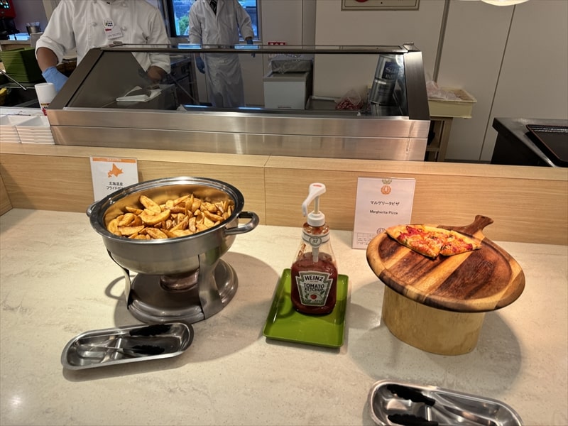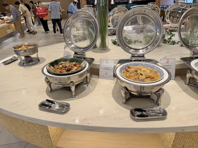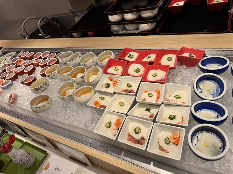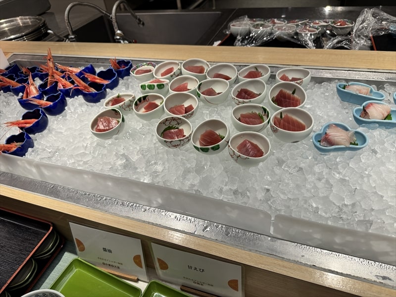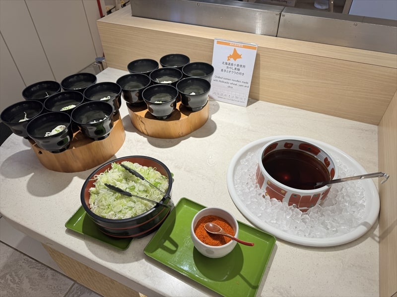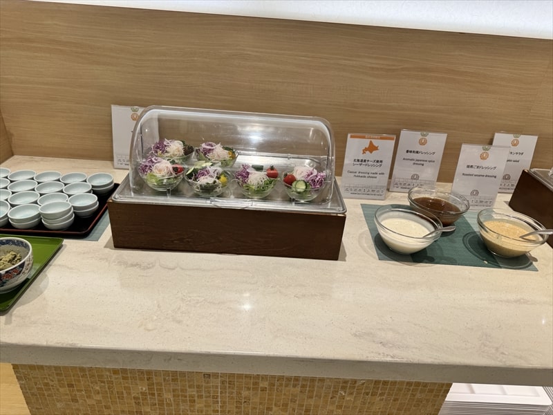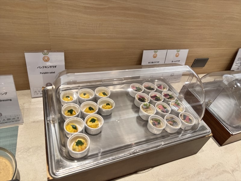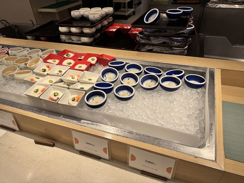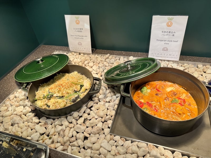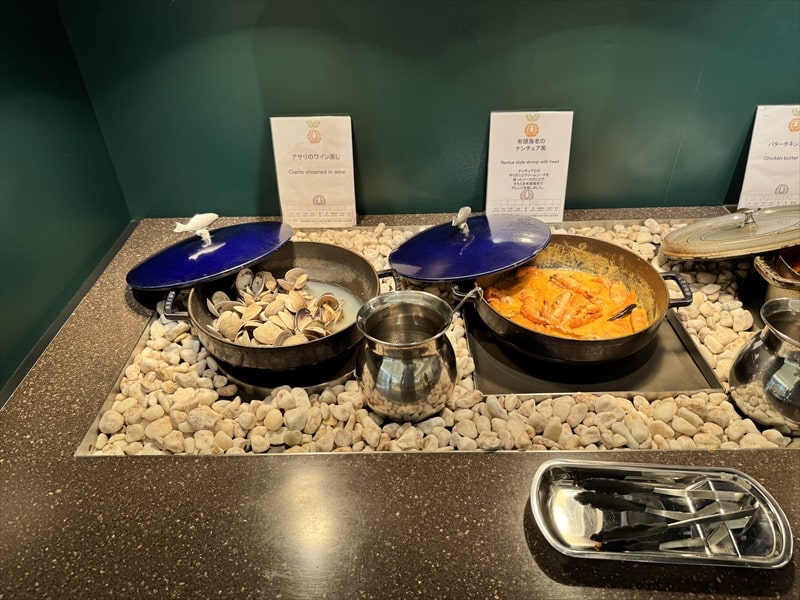 ビュッフェ料理は他には漬け焼き鯖のべっ甲甘酢庵掛け、日高産真カスベと冬瓜湯葉の炊合せ、鰻の冷し茶碗蒸し、カニ身とニラキャベツの玉子寄せ、ムキエビと新じゃがのセルベル・ドゥ・カニュ、北海道産フライドポテト、マルゲリータピザ、牛ステーキ、北海道産イワシと十勝マッシュのアヒージョ、ラム肉のグリル、ひらめの香草パン粉焼き、牛肉の煮込みハンガリー風、鶏の唐揚げ、ボンゴレビアンコ、早来産豚バラ肉の雲白肉などがあります。