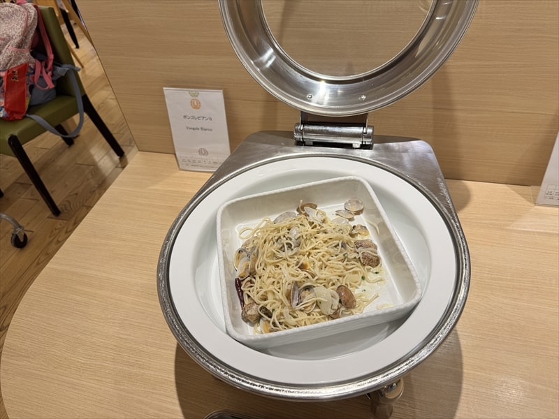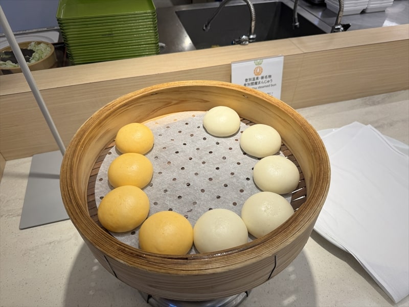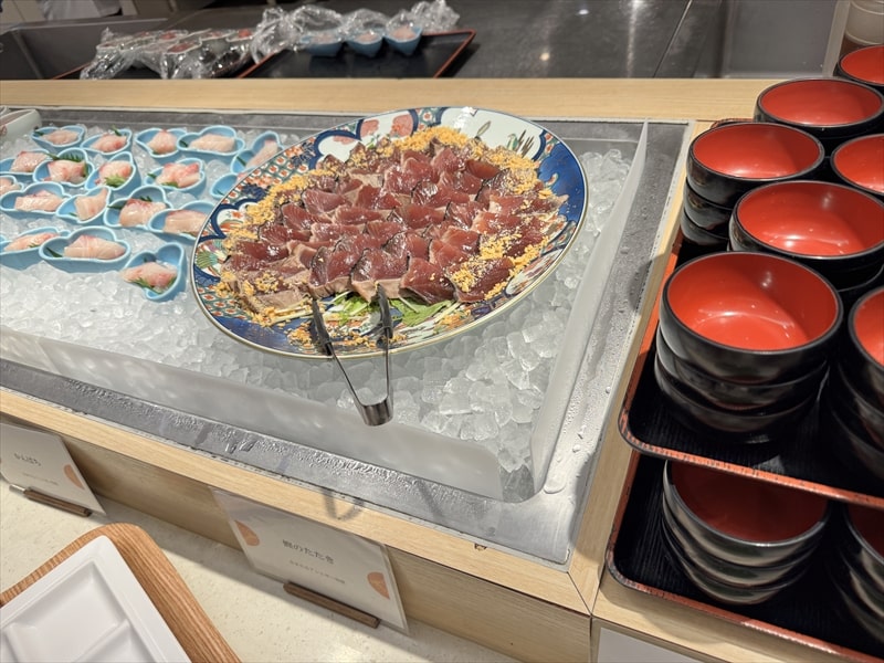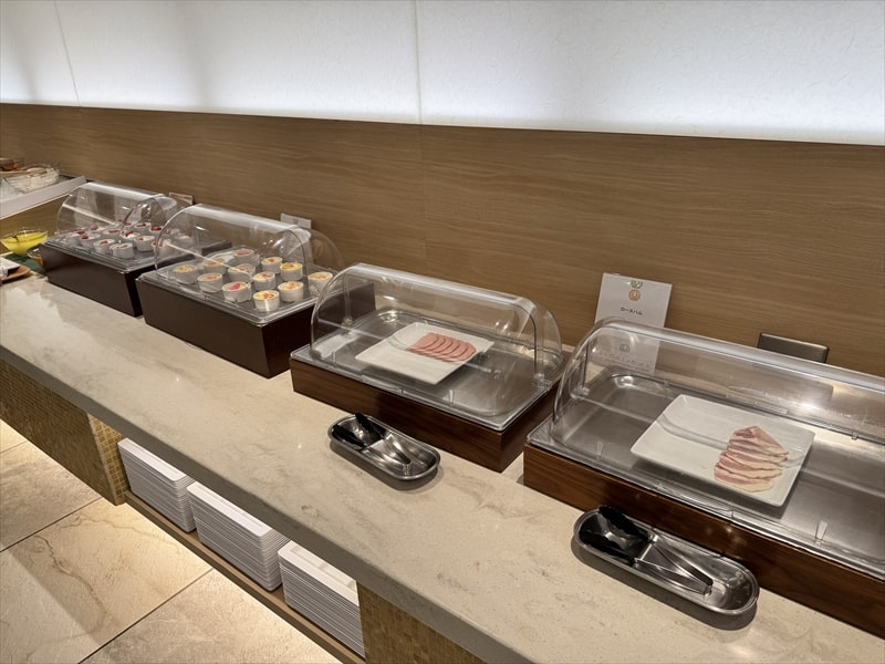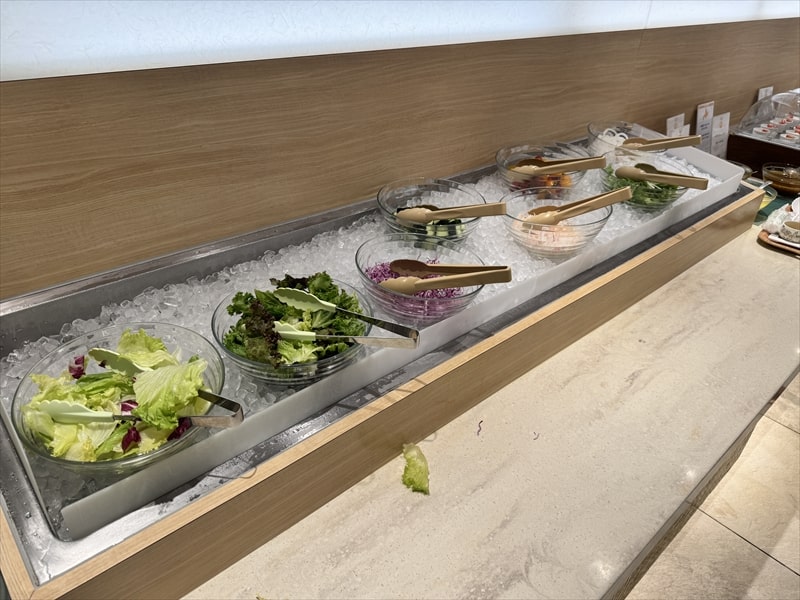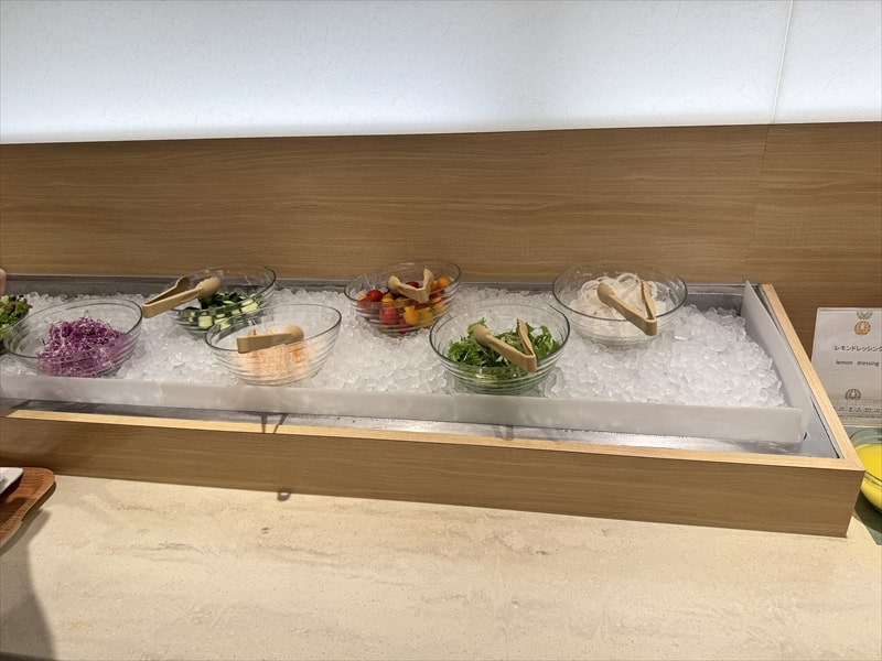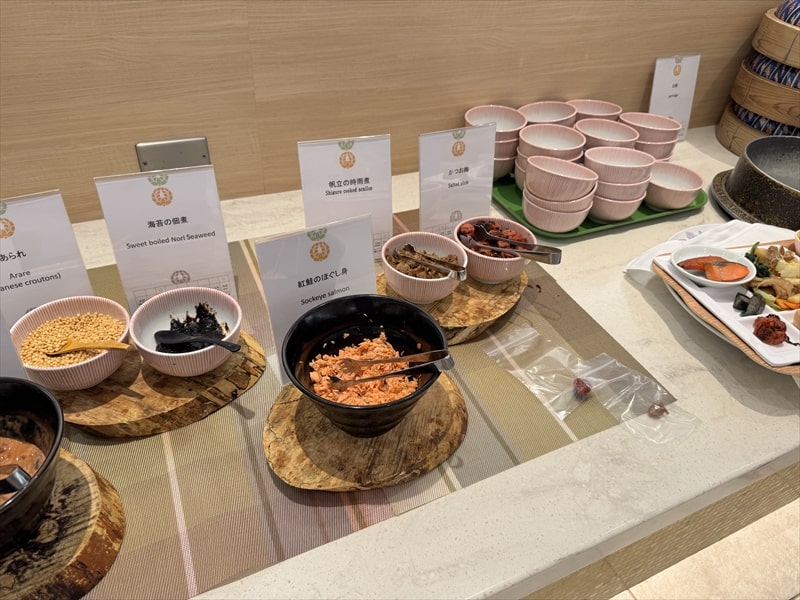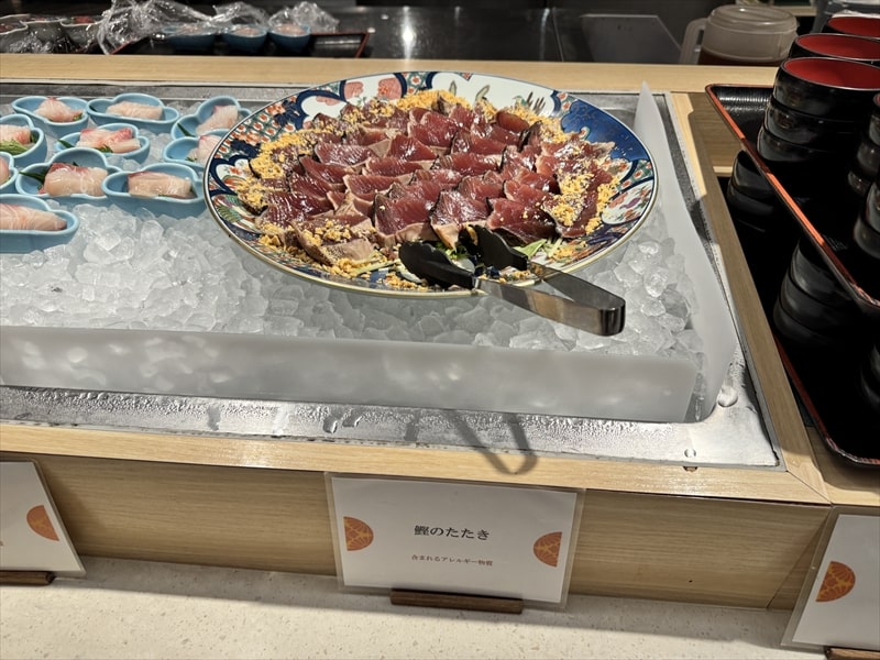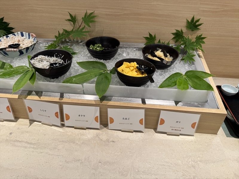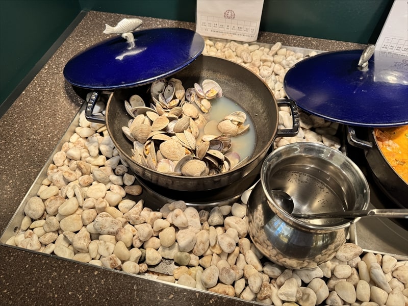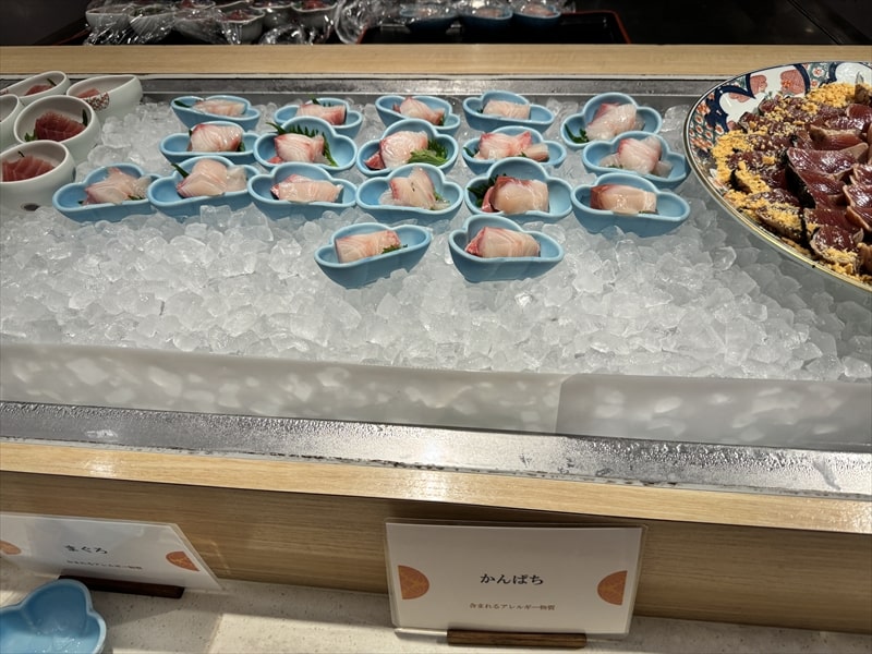 ビュッフェ料理は他には漬け焼き鯖のべっ甲甘酢庵掛け、日高産真カスベと冬瓜湯葉の炊合せ、鰻の冷し茶碗蒸し、カニ身とニラキャベツの玉子寄せ、ムキエビと新じゃがのセルベル・ドゥ・カニュ、北海道産フライドポテト、マルゲリータピザ、牛ステーキ、北海道産イワシと十勝マッシュのアヒージョ、ラム肉のグリル、ひらめの香草パン粉焼き、牛肉の煮込みハンガリー風、鶏の唐揚げ、ボンゴレビアンコ、早来産豚バラ肉の雲白肉などがあります。