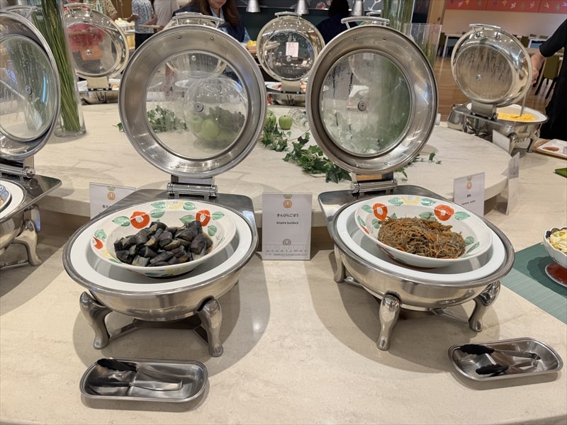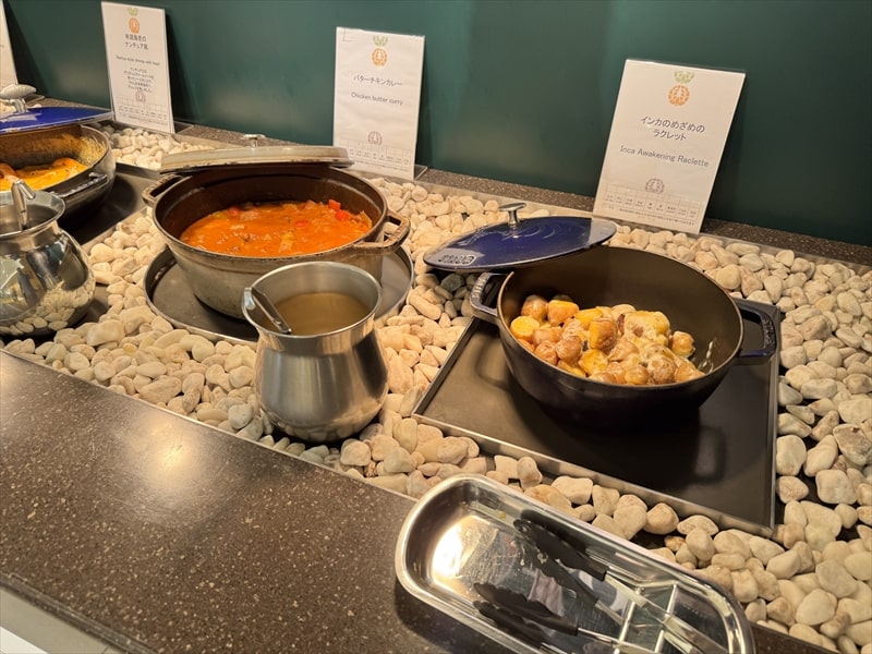 料理はとうもろこしのさつま揚げ、ホッケの味醂焼き、フレンチトースト、大根と鶏の炊き合わせ、筑前煮、きんぴらごぼう、アサリのワイン蒸し、有頭海老のナンチュア風、バターチキンカレー、インカのめざめのラクレット、ロースハム、ポテトサラダ、サラダバー、オニオンスープ、味噌汁などがありました。