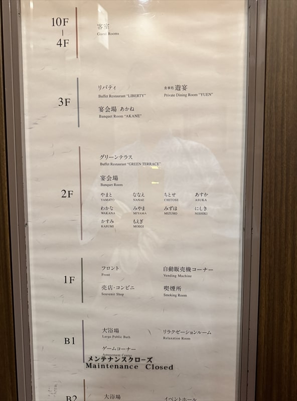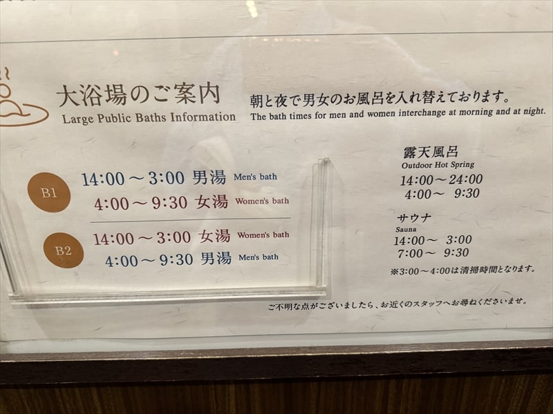 地下2階の大浴場は午後2時から翌日午前3時までが女性用、午前4時から午前9時30分が男性用となります。