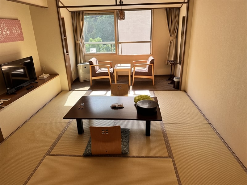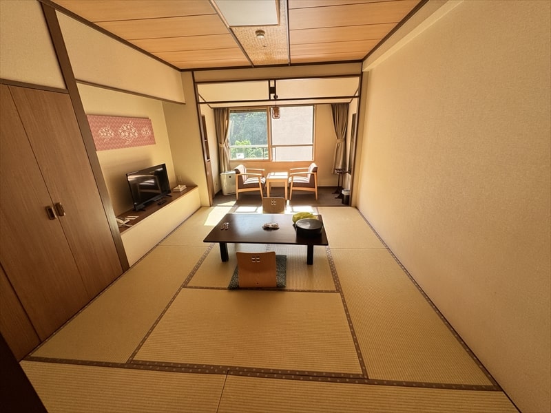 部屋は10畳の和室で道路側ではない山側の部屋でしたが、窓からの景色はそれほど良いものではありませんでした。