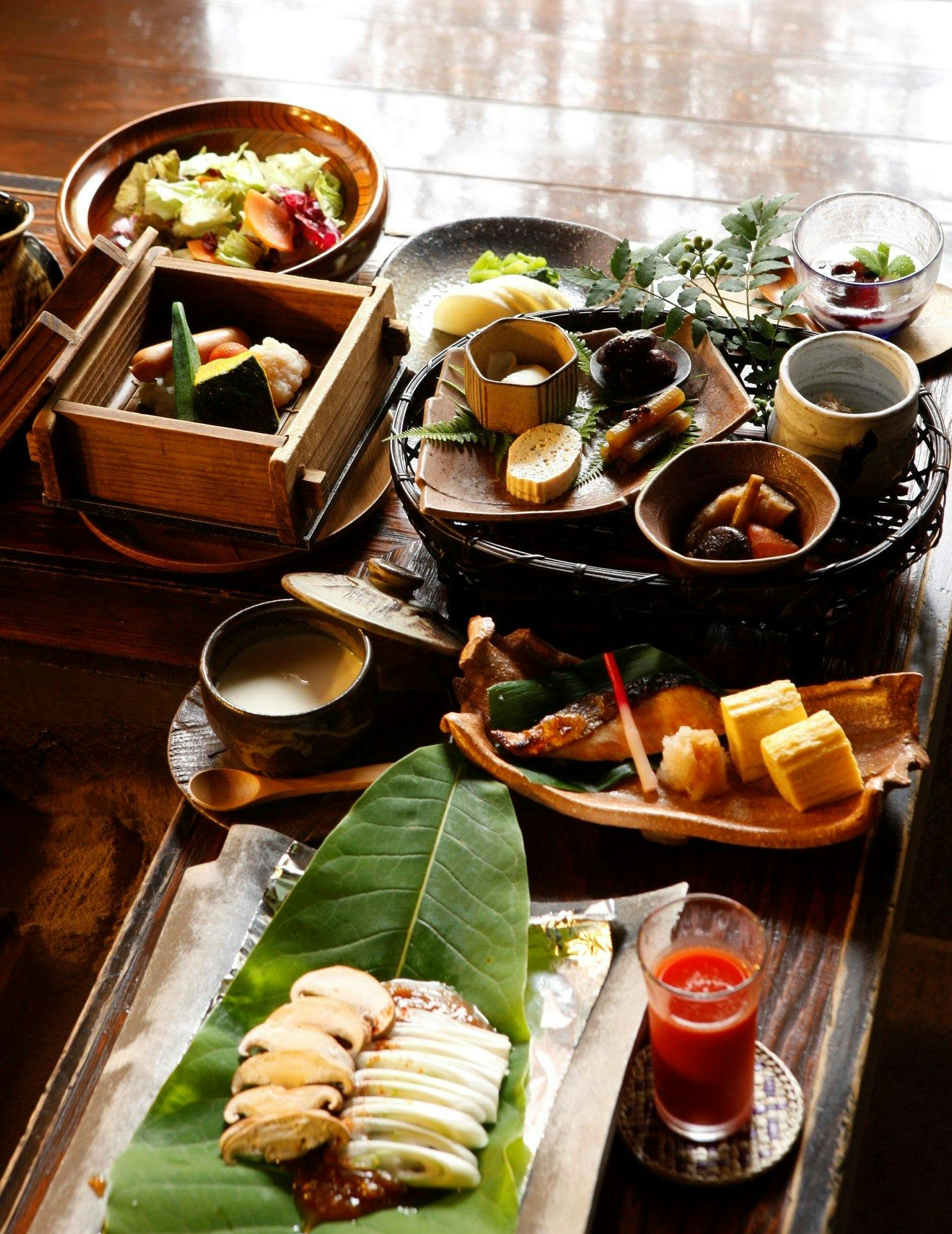 朝食の料理は朴葉味噌、蒸し野菜、サラダ、焼き塩鱒、出汁巻玉子、自家製豆腐、法連草お浸し、野菜煮物、花豆、湯葉蒟蒻、蕗煮物、こも豆腐、漬物、飛騨こしひかり、味噌汁、ヨーグルトとなっています。
