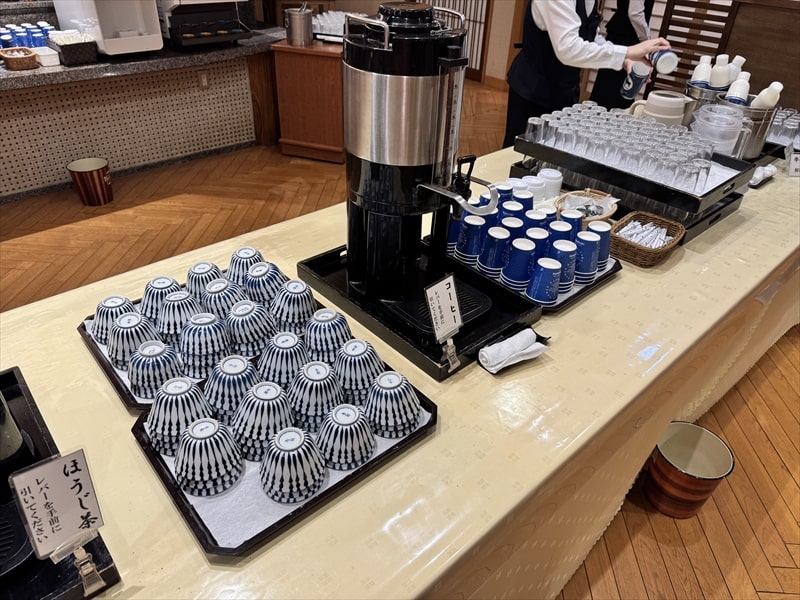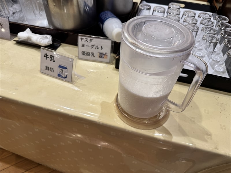 ドリンクはレストラン内のテーブルに置かれていて、コーヒーだけでなく美味しい牛乳やヤスダーヨーグルトがありました。