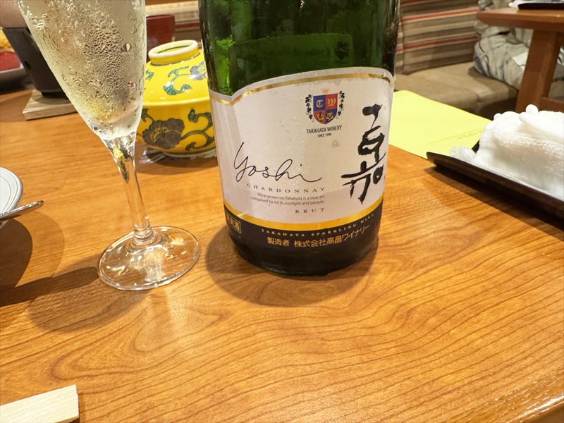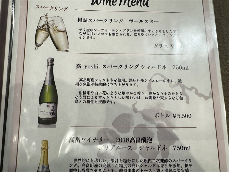 食事児のドリンクはリストを見ますと山形県の高畠ワイナリーの嘉スパークリング・シャルドネ5,500円がありましたので注文しました。