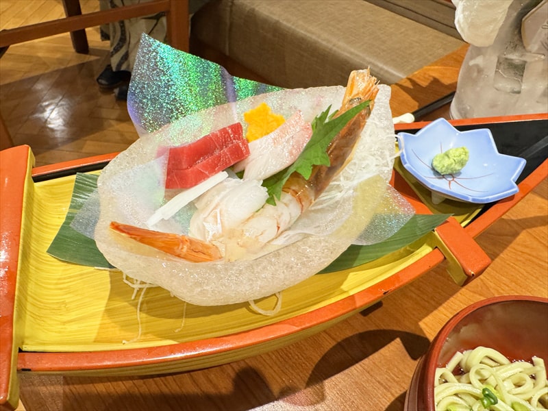 2、次は「お刺身」で 庄内浜で水揚げされた新鮮な真鯛を山形の美味しいご飯と一緒に