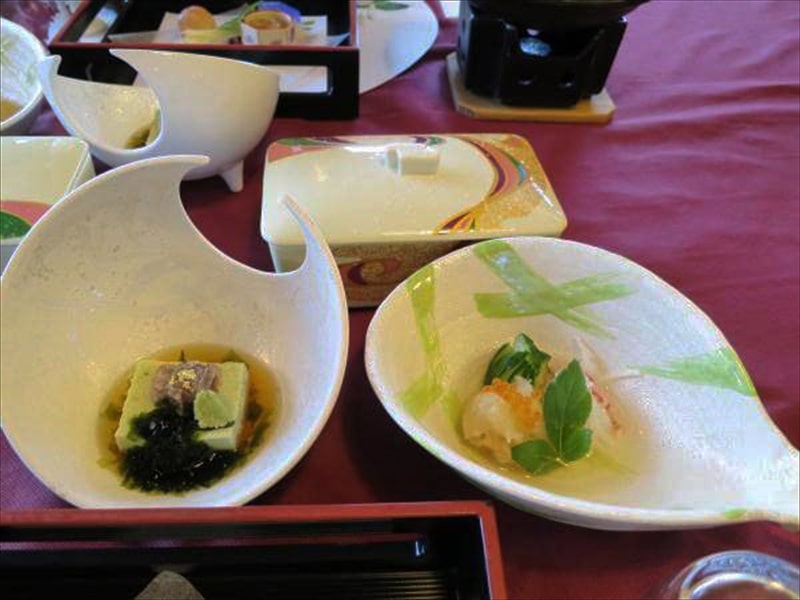 先付:山葵お浸し、新緑湯葉豆腐、子持飯蛸、生海苔、山葵
