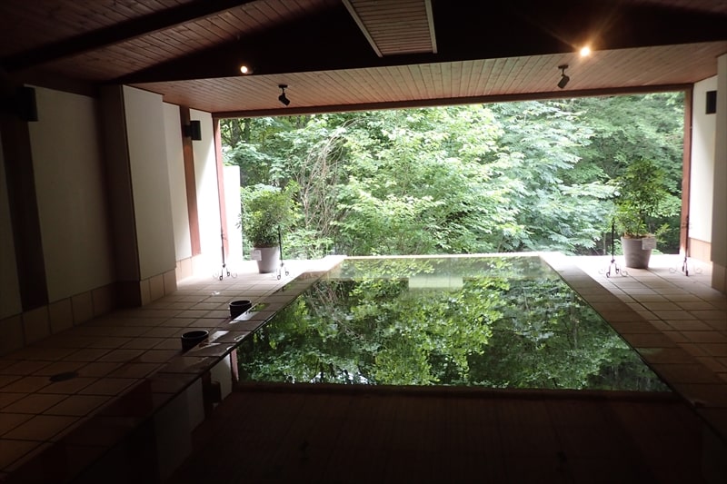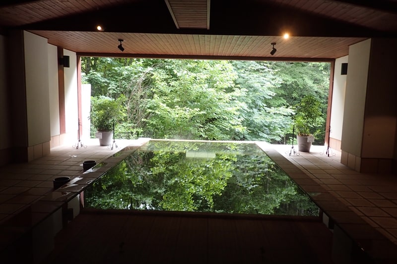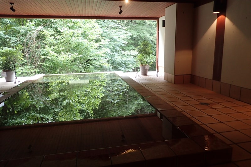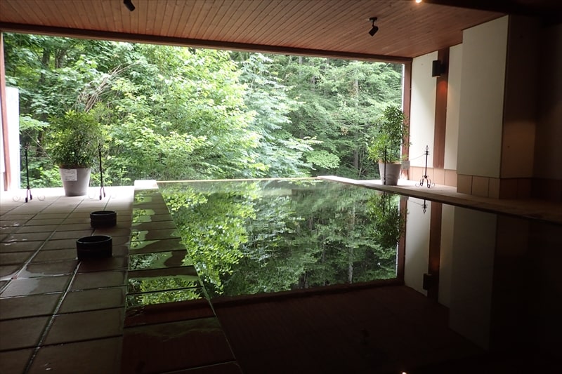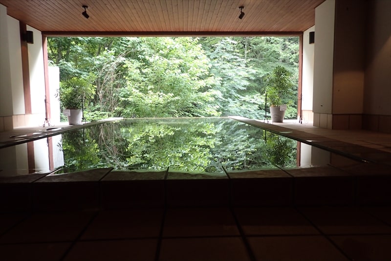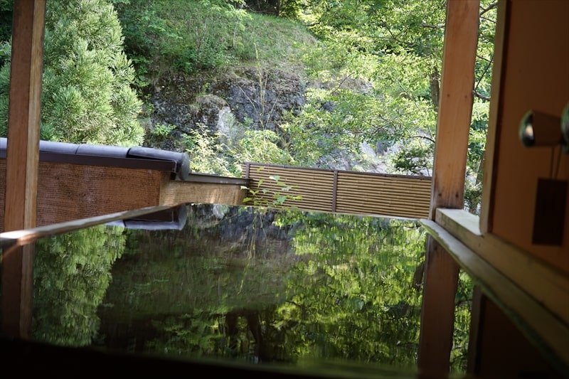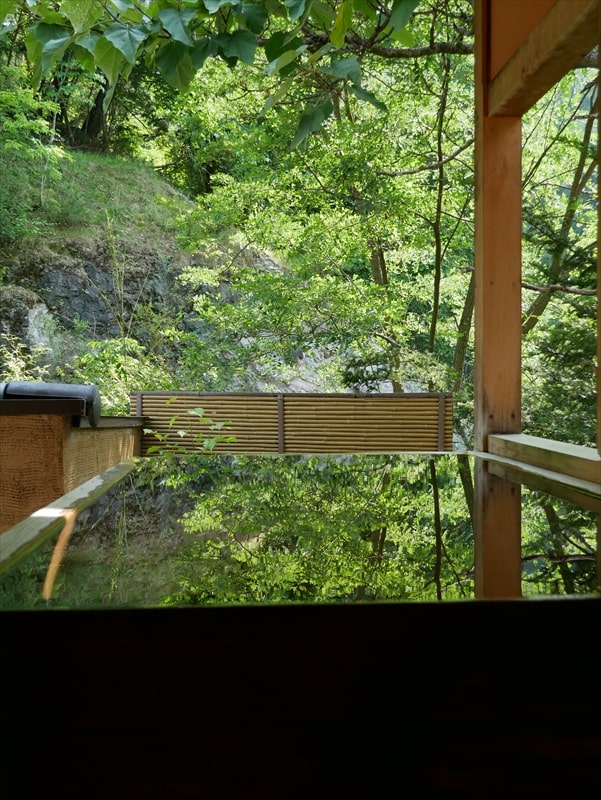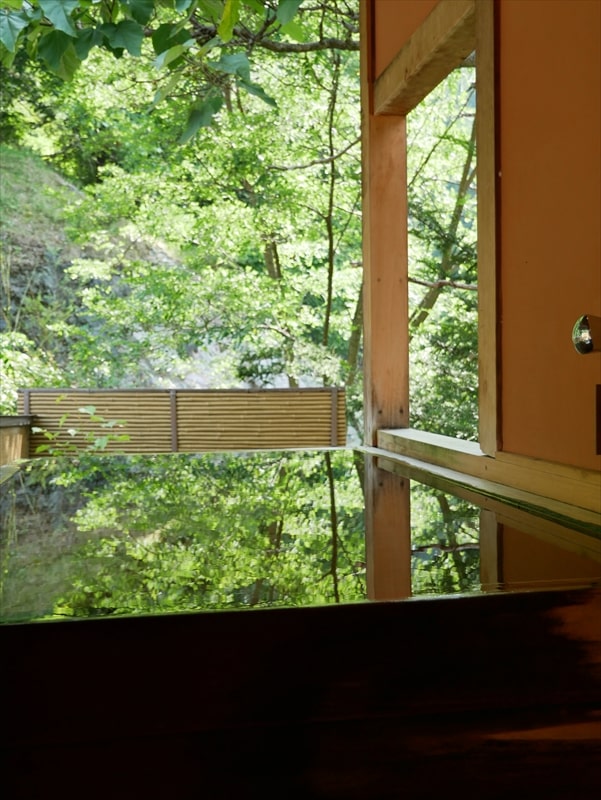 湯舟の端から景色を眺めるのも良いのですが、湯舟の奥から眺める景色も絵画を眺めるような雰囲気で素敵です。
