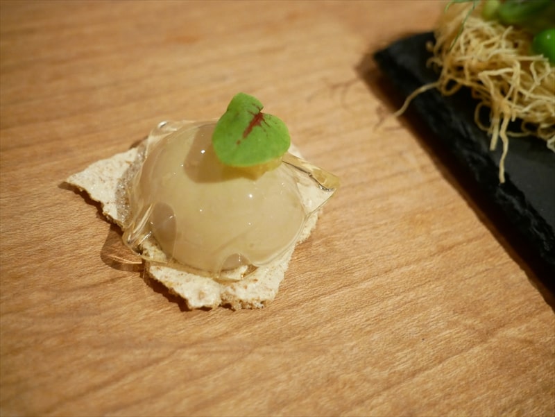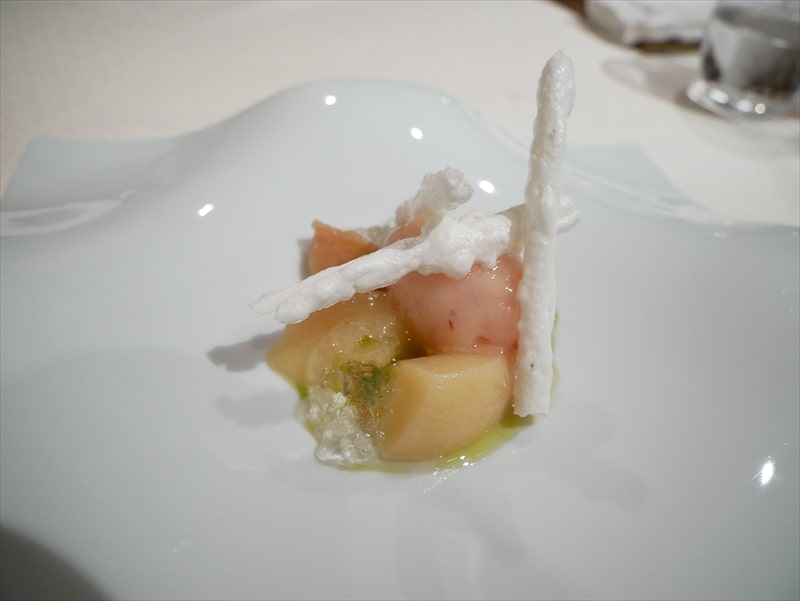 フォアグラのムース:メレンゲの板の上にフォアグラのムース、周りは林檎のゼリーと上に林檎のコンポート