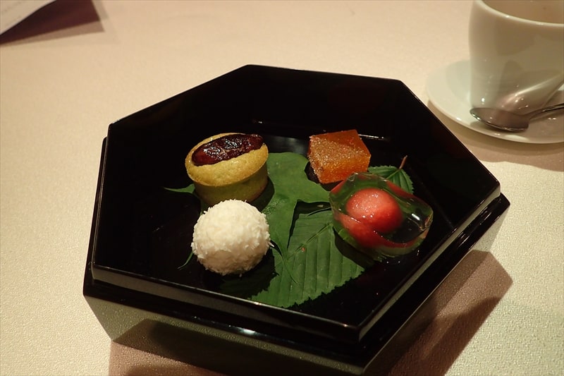 食後の焼き菓子はココナッツのムース、スイカのゼリー、花豆のケーキを煮詰めたゼリーとなっていました。