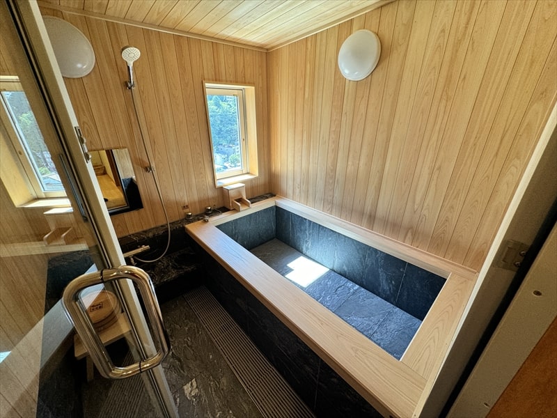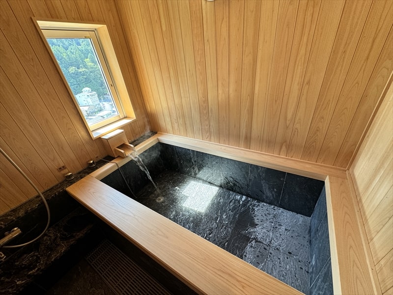 温泉は御影石と檜の風呂でとても広く、足を十分に伸ばすことができるものでした。