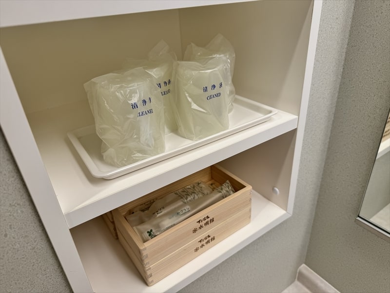 部屋風呂に入るためのバスタオルは一人1組、洗面で使うハンドタオルは温泉に持って行くものとは別に1組置かれていました。