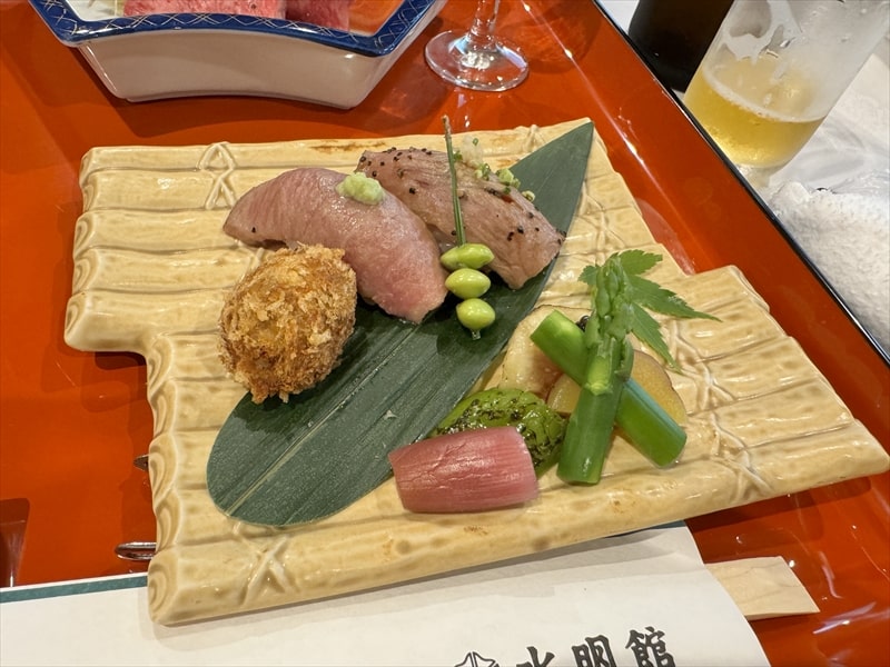 前菜:飛騨牛握り二種、楓一枝、煎り酒餡、山葵、浅月、生姜、焼万願寺と焼無花果、酢取茗荷、丸十檸檬煮、枝豆松葉刺し、飛騨牛一口コロッケ、キャビア