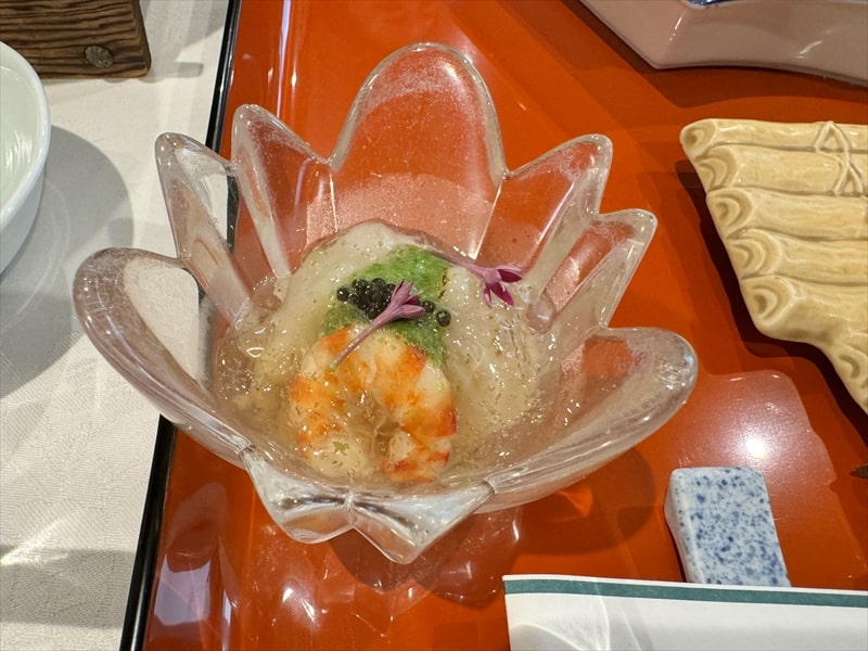 先附:白芋茎、糸瓜、巻海老、焼霜帆立、マイクロトマト、叩き陸蓮根、煎り米のジュレ、敷ピリ辛味噌、キャビア、振りライム