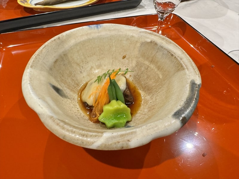 温物:飛騨牛柔か煮 針人参、馬鈴薯クリーム、隠元豆、青楓麩、粒芥子、木の芽、共地