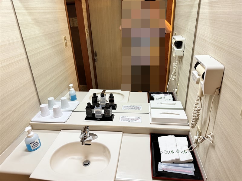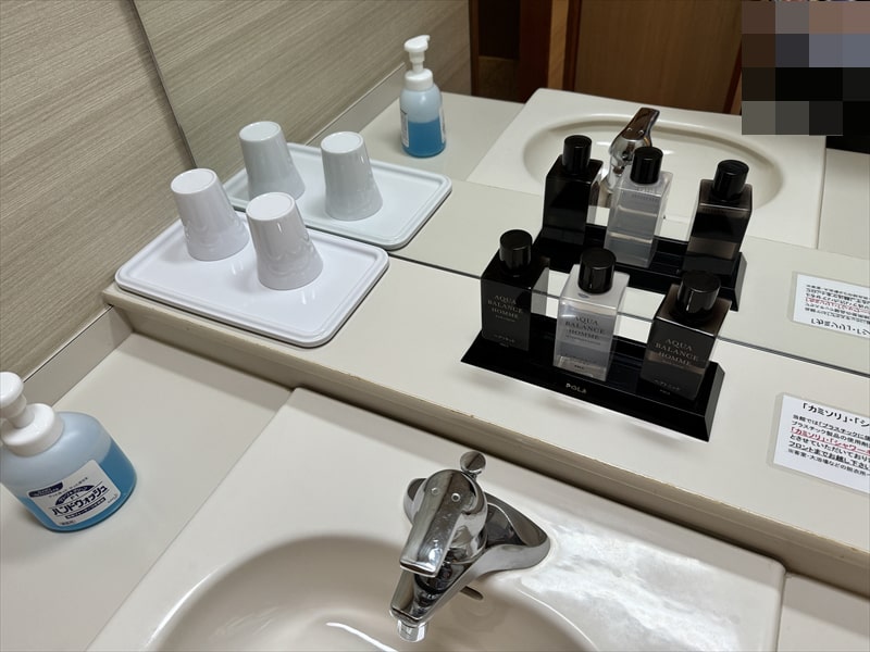 洗面所のアメニティはヘアトニック、ヘアリキッド、アフターシェイブローションだけですから化粧品は自宅から持ってきましょう。