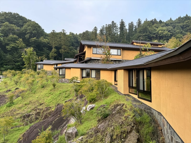 西月館の部屋の窓からは天望大露天風呂がある別館の帰郷邸の建物とその向こうにある人口の滝の流れと稲荷神社を眺めることができました。