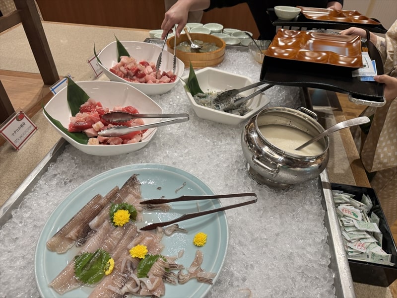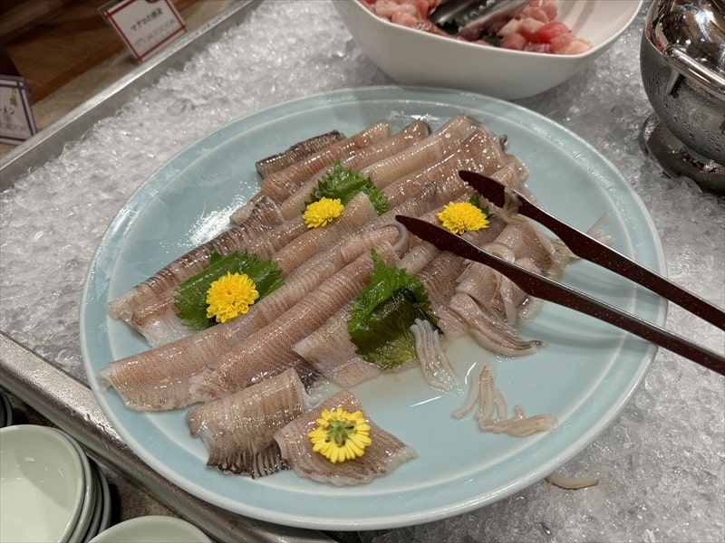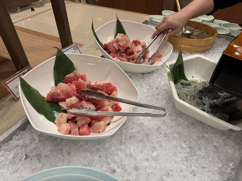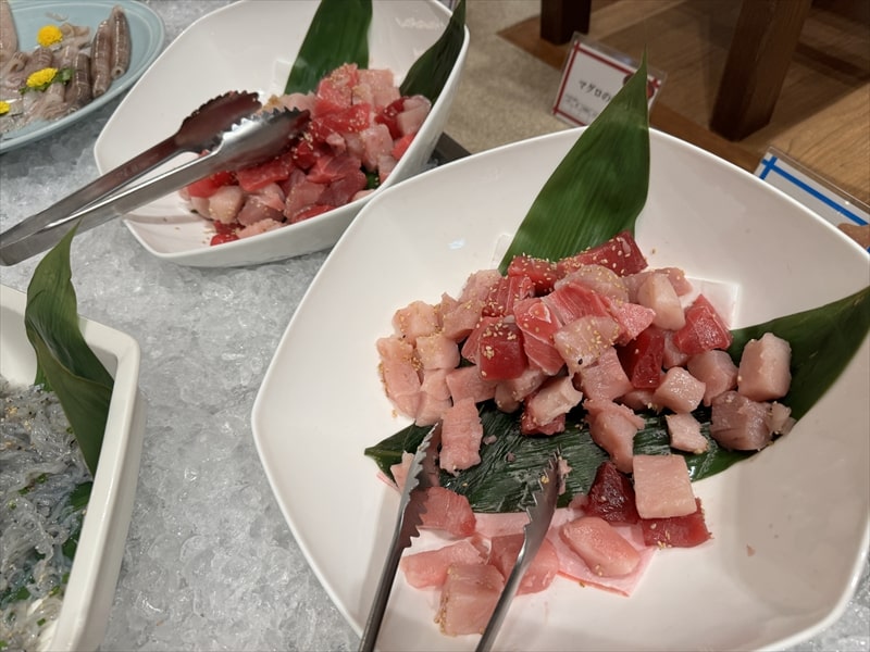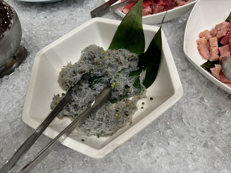 海鮮好きな私がうれしかったのは海鮮丼を作るコーナーがあり、鮪の刺身のぶつ切り、生しらす、烏賊ソーメンがあったことです。