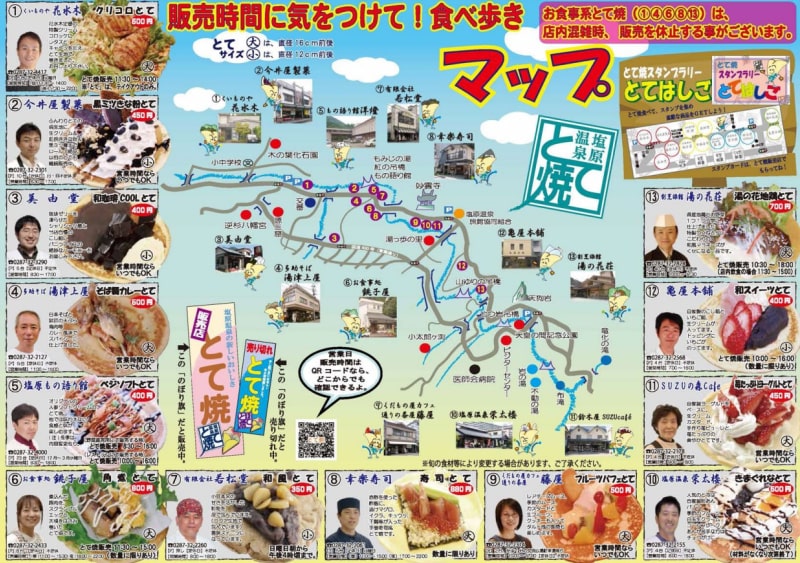 温泉街にはとて焼のお店が12店舗あって食べ歩きができる様になっています。