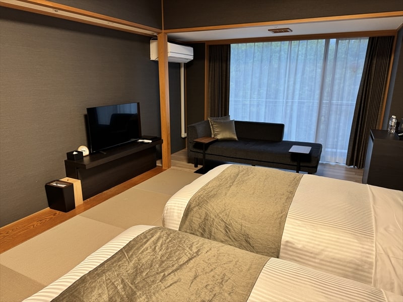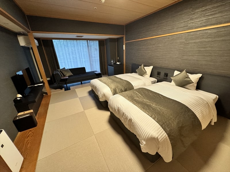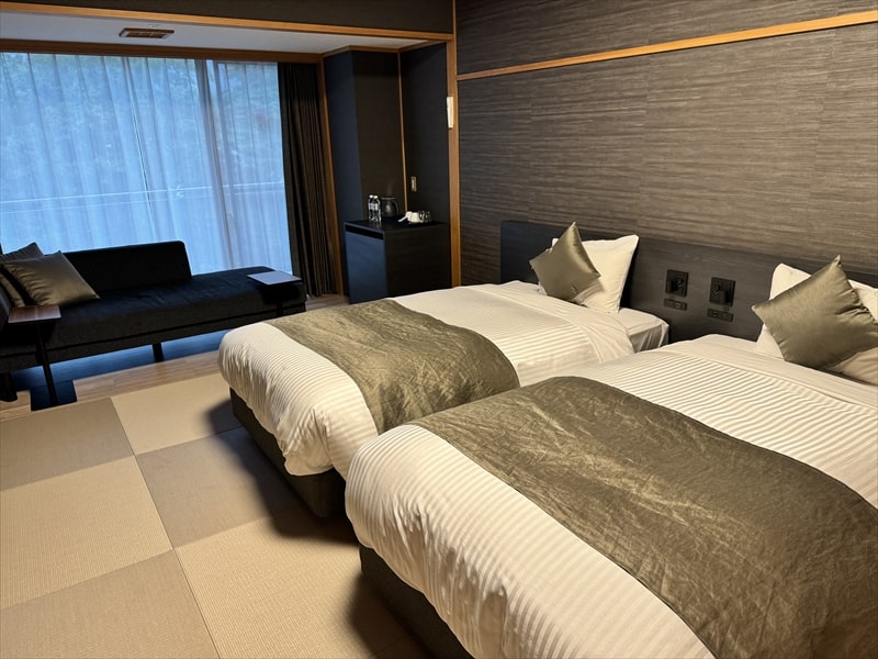 部屋は琉球畳の敷かれた和室にツインベッドが置かれていて、窓際にはソファーベッドが置かれています。