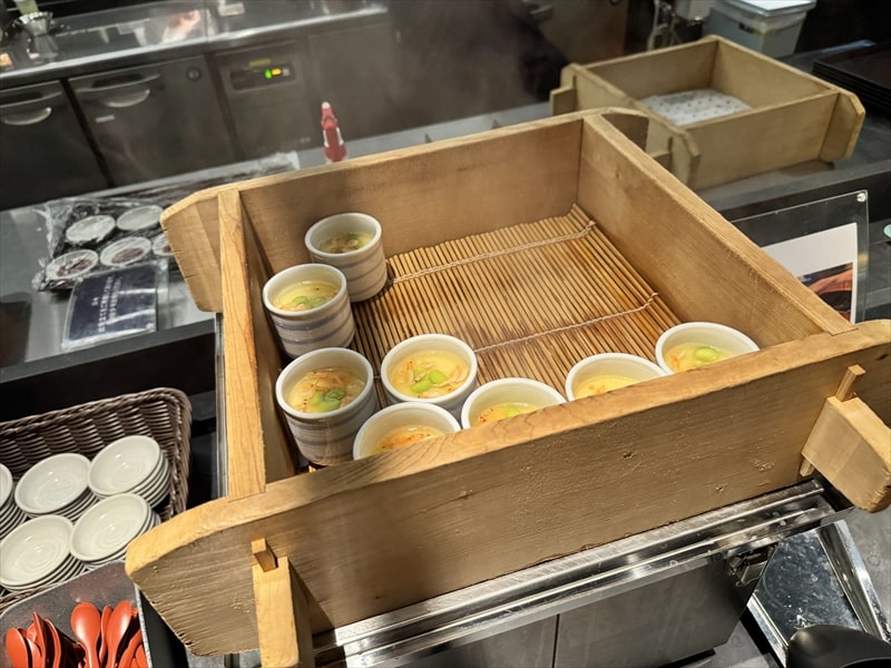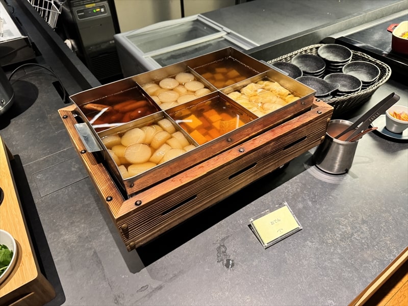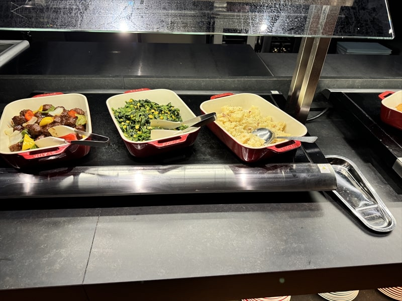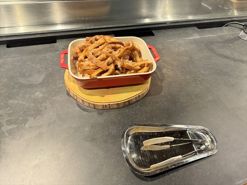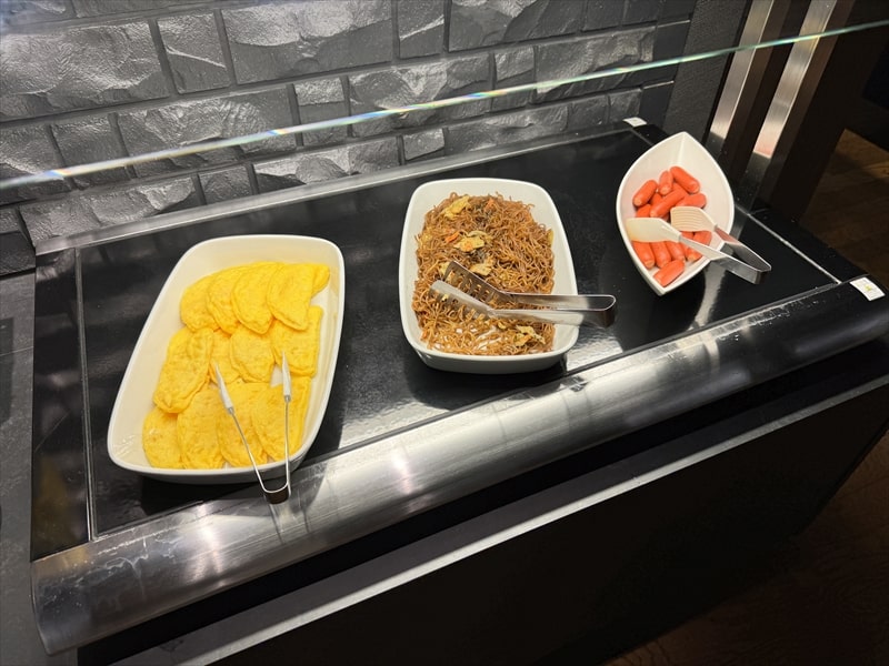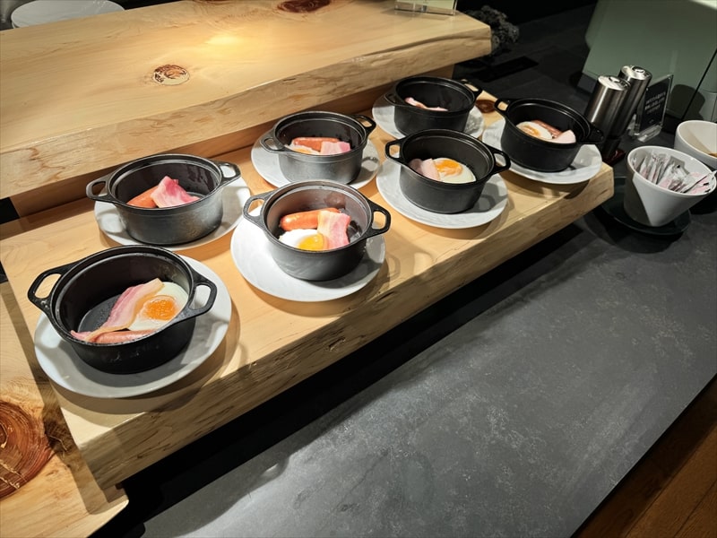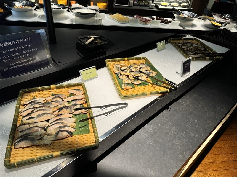 焼魚は好きなさかなを取り、自分の席に固形燃料が入ったコンロを持って行き温めて頂くのですが、このコンロでベーコンとソーセージを温めれば良かったかなと後で思いました。