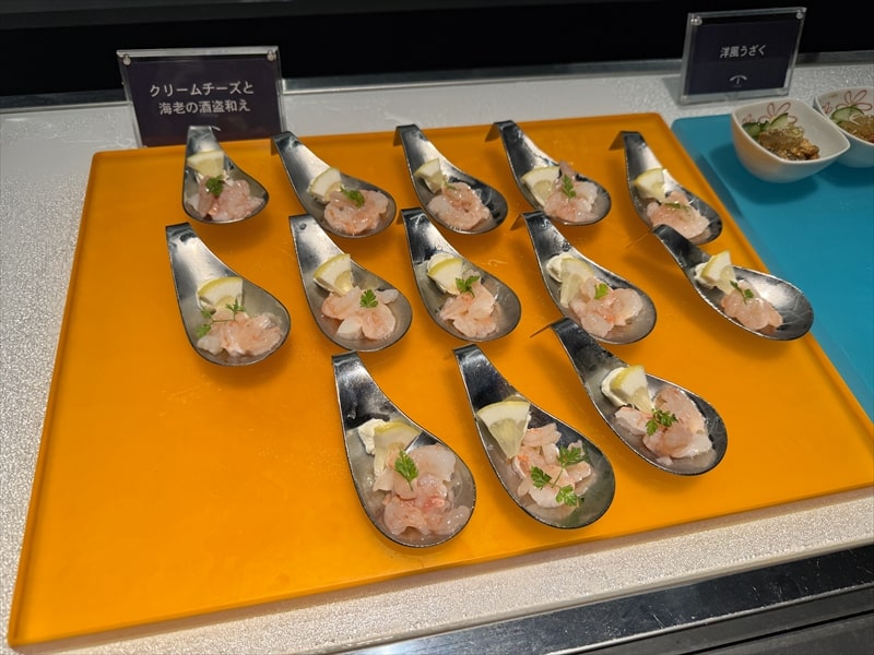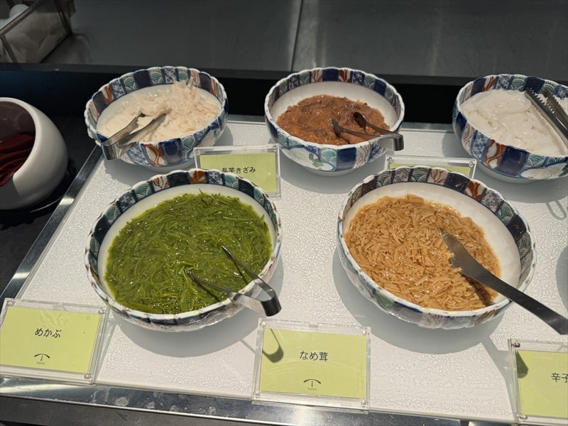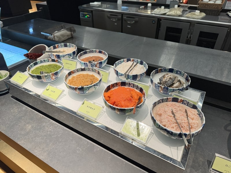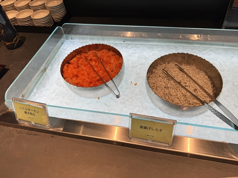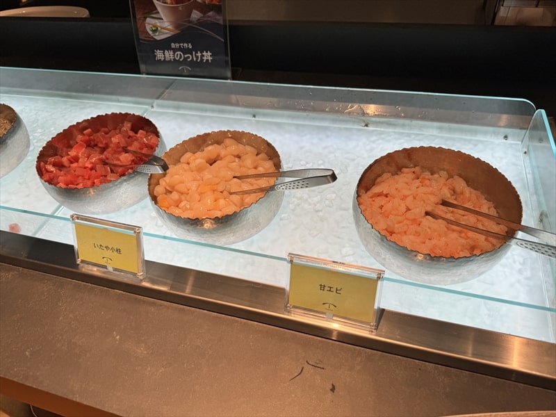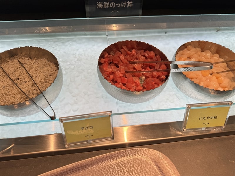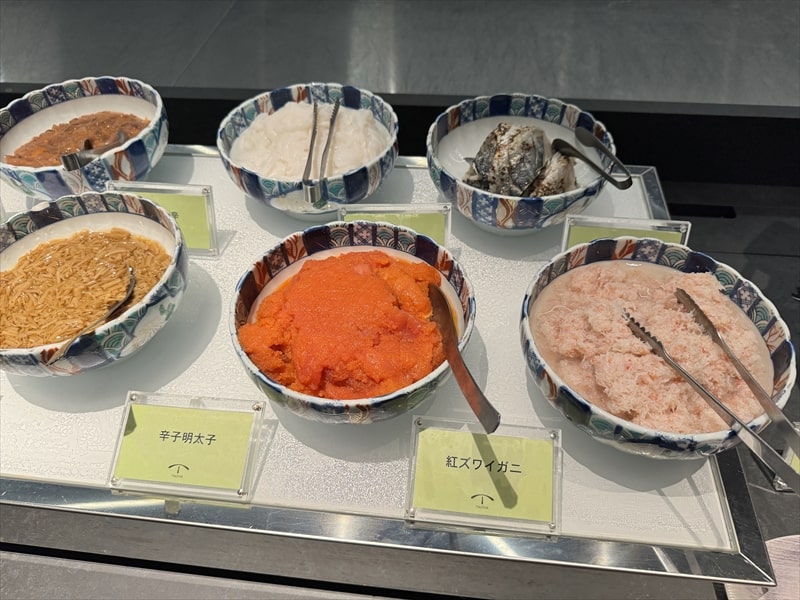 朝食で良かったのは海鮮丼を作ることができるコーナーがあり、具材は紅ズワイガニ、辛子明太子、烏賊ソーメン、烏賊の塩辛、甘えび、いたや小柱、マグロ、釜揚げしらす、いくらサーモン親子和えなどが置かれていました。