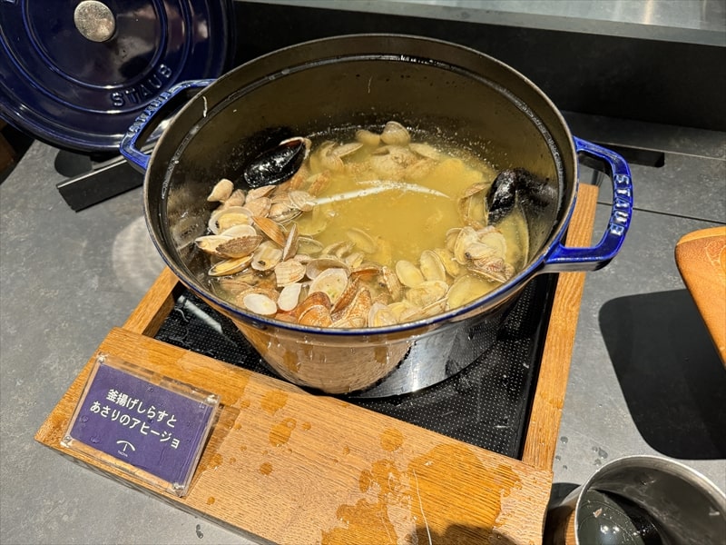 この時期のお薦めメニューとなっていた釜揚げしらすとあさりのアヒージョは各自がコンロで温めるものではなく温度が低い大鍋に入ったものを取り分けるといったものでがっかりしました。